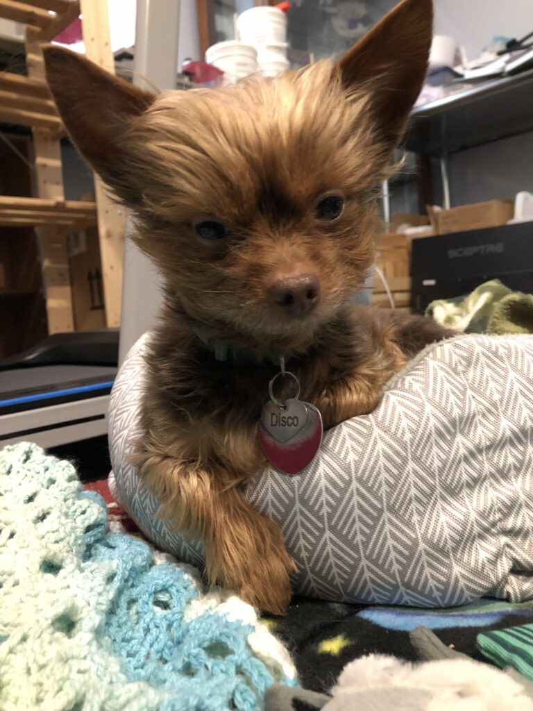 Disco is right at about 6 lbs, but he doesn’t believe that being small is a handicap. He has a huge personality and isn’t afraid of basically anything. Including larger dogs. He has absolutely no manners, will get right up in your face, and just wants to give you a kiss.