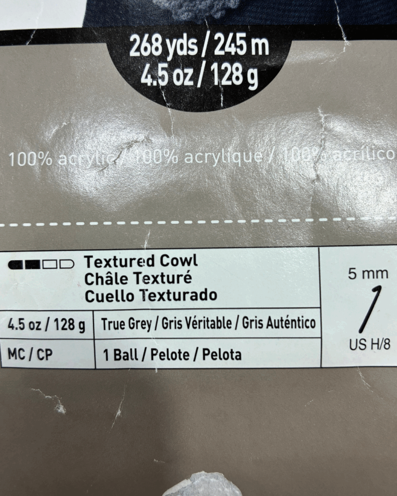 One of the first things you will see is how much yarn is in a skein. In the US, this is generally given in both ounces and grams. We see in our picture here that this skein has ounces, or 128 grams of yarn. It also tells us the suggested hook size (or knitting needle size) for this yarn. This is just a suggestion though, so if you tend to work tighter or looser, you may need to change this. You also may be using a pattern that suggests another hook size. That’s totally fine, this is just a starting point. Some yarn labels also give you an estimated length of the yarn in it, but in my experience, not all of them include this information.