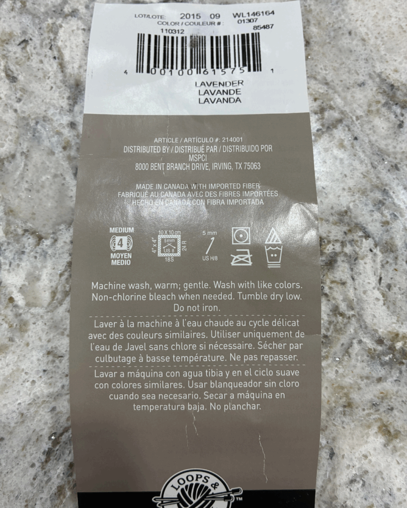 We’ll also see the fiber content of the yarn. These days the average skein of yarn tends to be 100% acrylic, as in our example label. But this is definitely not the only type of yarn available! You may see wool, bamboo, rayon, cotton, alpaca, silk, or other fiber types, in all sorts of combinations. Whenever you go to purchase yarn, spend some time looking at the different labels and feeling the yarn to see how you like the feel. You’ll start to notice the difference and develop a preference as you gain experience.