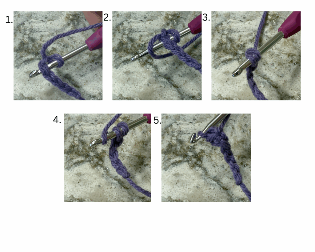 Next, yarn over again, and catch that strand in the hook part. Slide through the two loops that were previously on your hook, so that you are left with only one loop again.